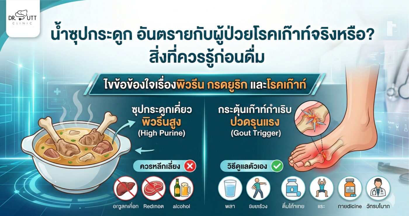 เนื่องจากกระบวนการเคี่ยวกระดูกเป็นเวลานาน จะทำให้สารพิวรีนจากกระดูกและเนื้อสัตว์ละลายออกมาในน้ำซุป ซึ่งอาจทำให้ระดับกรดยูริกในเลือดสูงขึ้น และกระตุ้นให้โรคเก๊าท์กำเริบได้ บทความนี้จะอธิบายอย่างชัดเจนว่า น้ำซุปกระดูกอันตรายกับผู้ป่วยโรคเก๊าท์อย่างไร พร้อมสัญญาณเตือนและวิธีดูแลตัวเอง